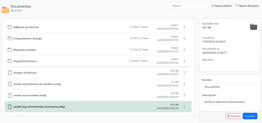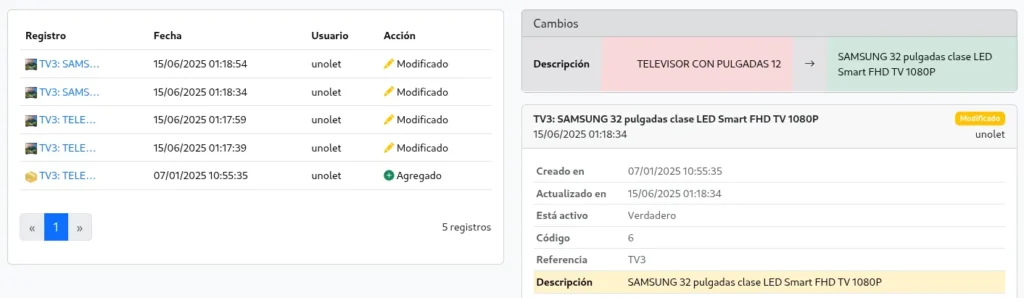 Unolet ERP mantiene un registro detallado y automático de todas las modificaciones realizadas en el sistema.